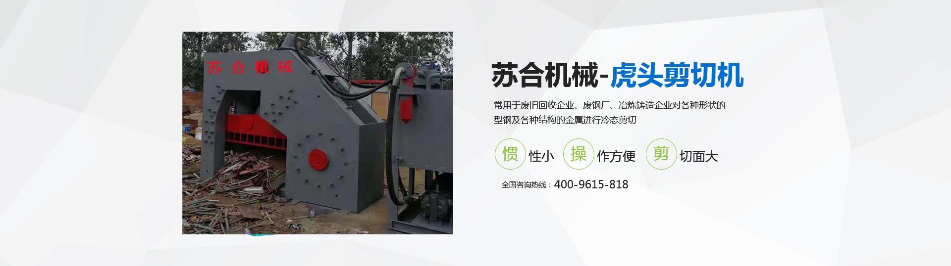 虎頭剪具有體積小、重量輕、慣性小、噪音低、動(dòng)作平穩(wěn)、操作方便、靈活、剪切斷面大、剪刀口調(diào)整方便等優(yōu)點(diǎn),操作使用安全。常用于廢舊回收企業(yè)、廢鋼廠、冶煉鑄造企業(yè)對(duì)各種形狀的型鋼及各種結(jié)構(gòu)的金屬進(jìn)行冷態(tài)剪切。剪切機(jī)的用途就是用來剪切定尺、切頭、切尾、切邊、切試樣及切除軋件的局部缺陷等。 滑縣蘇合機(jī)械制造有限公司性能穩(wěn)定,操作簡(jiǎn)單。歡迎來電咨詢 <了解更多>